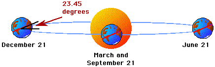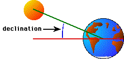 Checking this box will include the solar declination in the output data. Declination is the angular distance of the sun north or south of the earth's equator. The earth's equator is tilted 23.45 degrees with respect to the plane of the earth's orbit around the sun, so at various times during the year, as the earth orbits the sun, declination varies from 23.45 degrees north to 23.45 degrees south. This gives rise to the seasons. Around December 21, the northern hemisphere of the earth is tilted 23.45 degrees away from the sun, which is the winter solstice for the northern hemisphere and the summer solstice for the southern hemisphere. Around June 21, the southern hemisphere is tilted 23.45 degrees away from the sun, which is the summer solstice for the northern hemisphere and winter solstice for the southern hemisphere. On March 21 and September 21 are the fall and spring equinoxes when the sun is passing directly over the equator. Note that the tropics of cancer and capricorn mark the maximum declination of the sun in each hemisphere. Declination is calculated with the following formula: